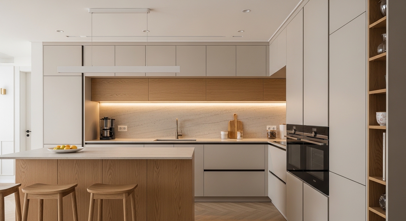 무광 도장 마감의 맞춤 제작 키친 가구와 엔지니어드 스톤 상판 적용